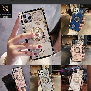 Made of soft TPU for protection with a square-edge design, this cover features rhinestone clover accents, a rotating ring holder, and metallic frame details for a trendy, high-end look.