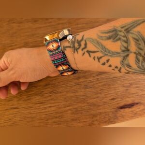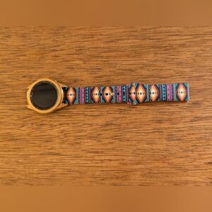 Stylish gold smartwatch featuring a vibrant patterned strap. Perfect for tech-savvy individuals who love a touch of color.