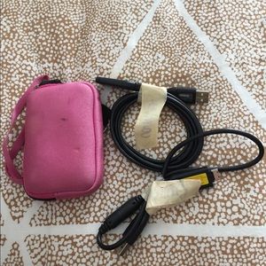 Digital camera with case and 2 adapters. Shows picture on front of camera too