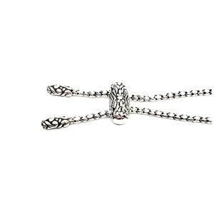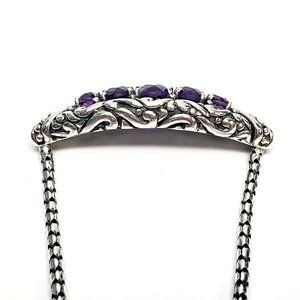 Samuel B sterling silver adjustable slide bracelet in the Artisan Jewelry Collection. Center station features 5 purple amethyst stones set within scroll designs. The snake chain bracelet adjusts with a slide bolo bead.