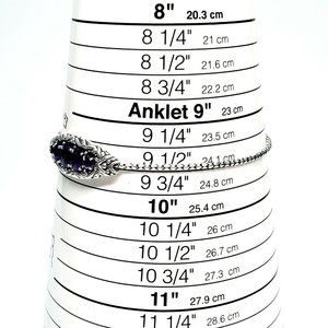 Measures approx. 9" at longest, adjustable down to smaller sizes. Stones measure 4mm round, 5x7mm oval, and 6x8mm oval. Center station measure approx 1 1/2" wide, 1/2" high, 1/4" deep. Bracelet measures approx 2mm wide.