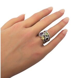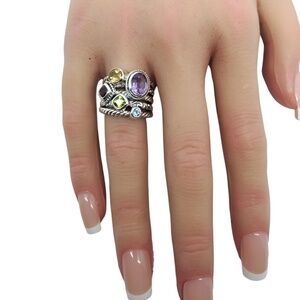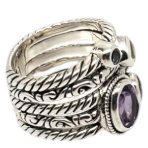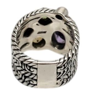 This beautiful multi strand gemstone ring by Samuel B features an oval shape amethyst, round citrine, round bluet topaz, square peridot & square garnet set in sterling silver.