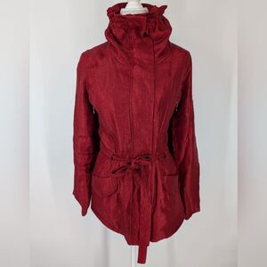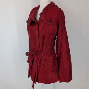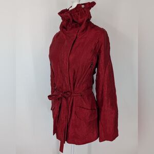 Samuel Dong Designer Shimmer Red Belted Lightweight Coat with Ruffle Neck Medium