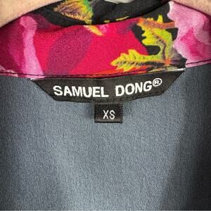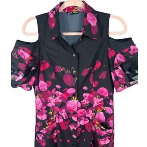 Samuel Dong Floral midi dress open shoulder ruffle sleeves black and pink