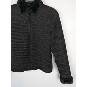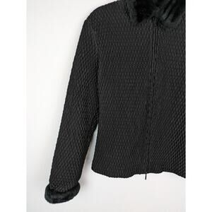 Features and description: jacket; zip up; long sleeves; quilted textured fabric; faux fur collar and cuffs; black
