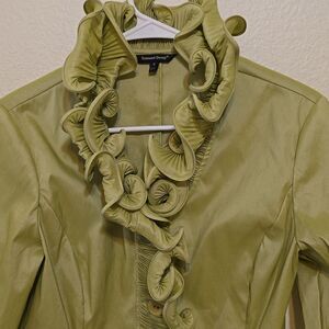 Bautiful button-up designer blouse with wire/ruffle collar. stretchy and flattering.