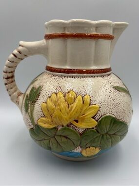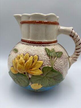 The Samuel Lear Pond Lily & Rope Pattern Majolica Pitcher is a reproduction piece featuring a beautiful multicolor design of flowers and ropes. This medium-sized pitcher has a unique rope handle and a patterned finish, perfect for adding a touch of charm to any kitchen or home decor. This pitcher captures the essence of a flower theme with a modern twist.