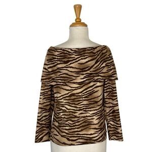 Elegant long sleeve top in vibrant browns and blacks in a tiger striped part featuring drop shoulders with folded over top.