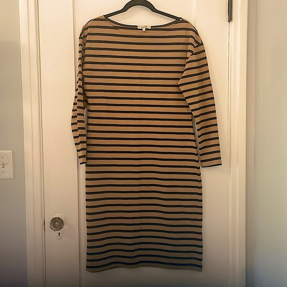Excellent condition. Somogyi size medium desert brown and black striped dress three-quarter sleeves. Hits at The. I am 5‘4“. Hundred percent cotton. From a non-smoking no pets home. Clean and ready to ship.