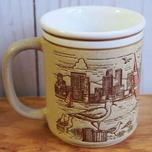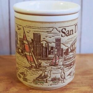 Vintage 70s truck stop coffee mug for San Diego, California. Very nice beige stoneware featuring embossed illustrations of the skyline of "America's Finest City"!