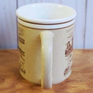 The outside of the mug is a beige tone with a mostly brown illustration (some pops of red and green), with two tan lines around the lip, and a white hue inside. Ceramic mug, holds 1 cup of hot liquid (can be used cold too, but hot is its main means). Measures approx 3.75" H x 4.25" W (lip to handle edge).