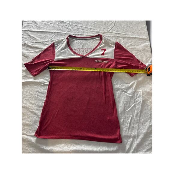 Show your 49ers pride with this women’s Colin Kaepernick #7 short-sleeve v-neck tee. Features bold team graphics on both front and back in classic red and white. Lightweight, soft, and perfect for game day or casual wear.