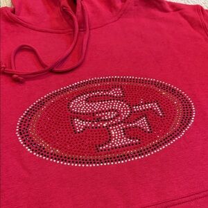 Stylish red hoodie with SF logo. Perfect for casual wear. Rhinestone logo on front and sequin 49ers on the back.