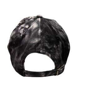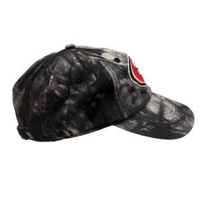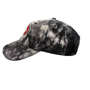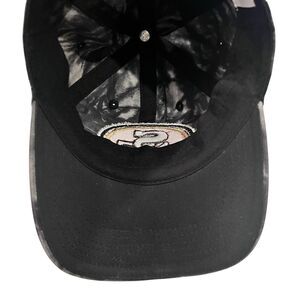 This is a San Francisco 49ers cap featuring the teams iconic red and gold oval SF embroidered logo on the front. The hat has a black and gray tie-dye style pattern, with a curved bill and stitched detailing. Adjustable. Great condition.