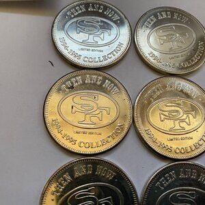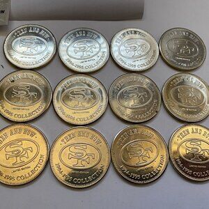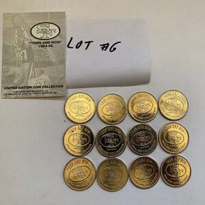 San Francisco 49ers then and now 1994-95 collectable coins 12 of 20 Lot #6 . 12 coins out of 20. Two coins have some small coating damage. See pictures 4+5 for back and 6+8+9 for front please.