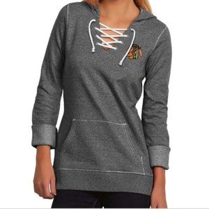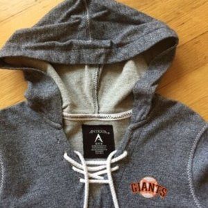 Antigua MLB sportswear brand. Size Medium. Color blue grey with white stitching and string laces. V neck lace up embellishment. pull over sweatshirt hooded sweater with kangaroo waist pocket. long sleeve can be rolled up to 3/4 sleeves as seen on model. Stock image used to show style and fit. Actual photos of the item show Giants baseball logo on chest. Gently washed and worn. Silver metal grommets came loose in wash on top laces. can be adjusted not noticeable when worn. Good condition