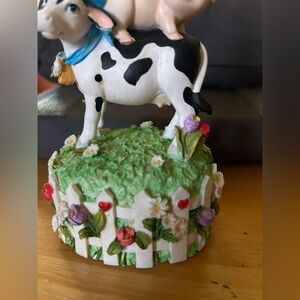 San Francisco Music Box Company Farm Animals Music Box features a charming cow, pig, and goose figures, it winds up to play a musical tune. Perfect for collectors or music box enthusiasts, this piece adds a touch of whimsy and charm to any home or office space.