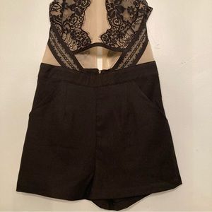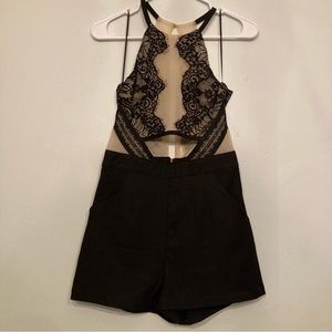 SAN JOY BLACK AND TAN LACE HALTER TOP ROMPER SHORTS