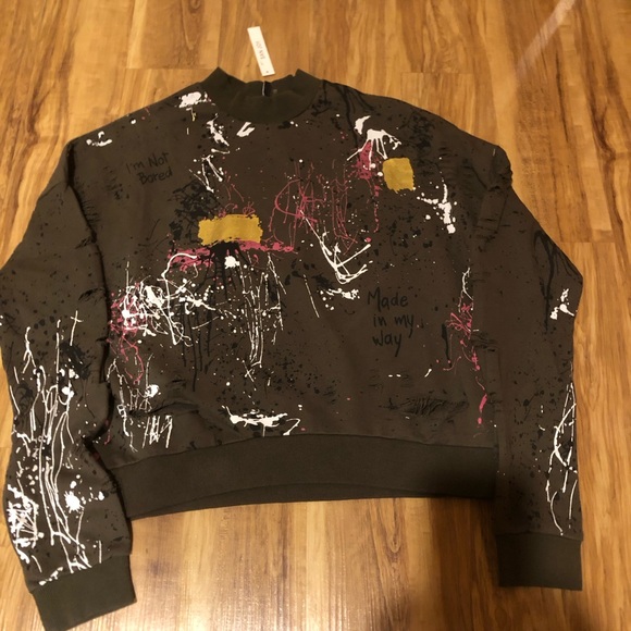 Stylish dark green sweatshirt with artistic splatter design. Features pink, white, and gold accents. Comfortable and trendy.