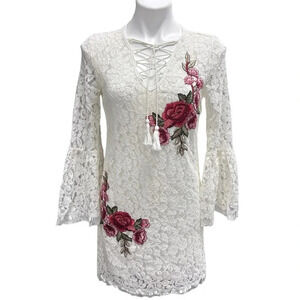 San Joy White Lace Bell Sleeve Mini Dress with Floral Detail Size Medium