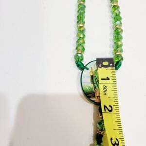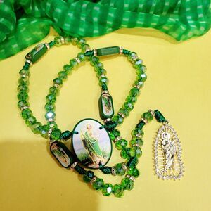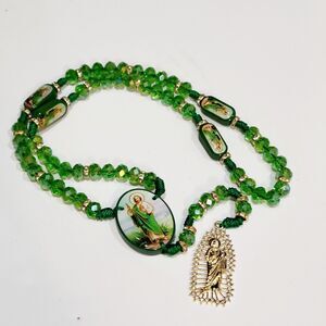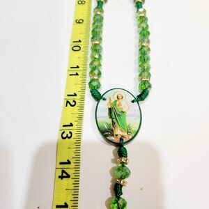 Saint Jude Rosary Necklace crystal green beads Rosario San Judas Tadeo 10mm 2 sided. Very pretty and shiny. This is beautifully handcrafted with crystals, Rhinestones, gold colored seperaters and thread. Please refer to the pictures for details and measurement.