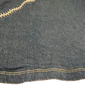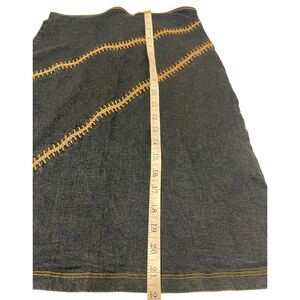 Rare Y2K denim skirt with bold whipstitch embroidery and modest below-the-knee A-line fit.