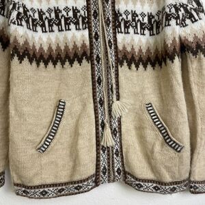 This listing is for a San Miguel Alpaca Women's Hooded Sweater. Full zip down the front. Cream/Brown. Zig zag alpaca design throughout. Made in Peru.