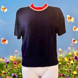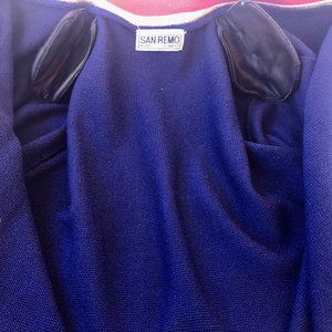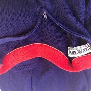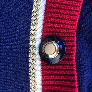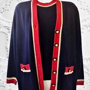 San Remo by Laura Knit Vintage 80's Cardigan Sweater Twin Set in navy blue & red, white and gold. Short sleeve top with back zipper. Cardigan sweater has elegant buttons. The sweater has shoulder pads.