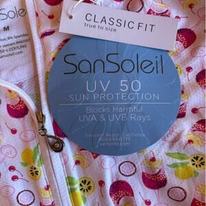 San Soleil quarter zip pullover in NWT condition and no flaws noted. The shirt is made from a soft, lightweight, slightly textured performance fabric and features mesh panels on underside of sleeves, and a crystal in the zip pull - see photos. It has a fitted silhouette and is perfect for any outdoor activity where sun protection and movement are essential. Measures app'x: 18.5 inches pit to pit, 17.5 across waist, 19.5 across bottom and 24 long.