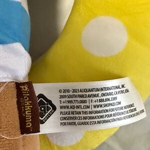 Adorable brown bear plush toy featuring a yellow polka dot ring. Perfect for kids to cuddle and play with.