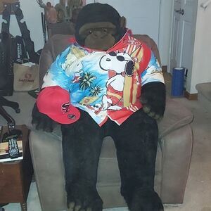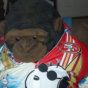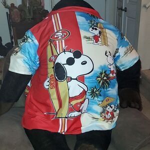 This cool shirt has the Charlie Brown character Snoopy on it. The collaboration San Francisco 49ers and Snoopy Aloha shirt is a men's size 4XL.