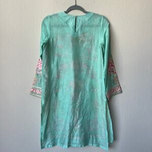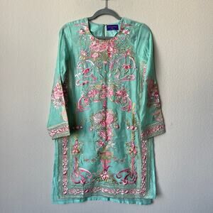 Sana Safinaz embroidered kurta tunic. Intricately embroidered featuring a floral tapestry in shades of pink on a rich aqua green base. Crafted from a lightweight, soft cotton fabric with a relaxed straight silhouette and 3/4 length sleeves. Size tagged small, fits slightly oversized - 19" pit to pit; 35" length.