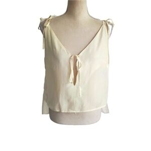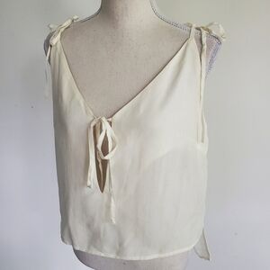 Sancia off-white cupro camisole with tie sleeves, open tie front, and slight high low hem. Partially lined, slightly sheer where the lining ends.