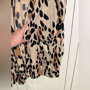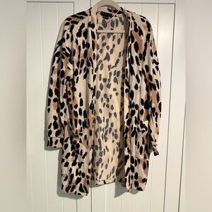 Chic Sanctuary cardigan with bold animal print. Features black and tan patterns.
