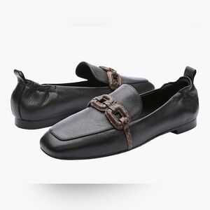 Experience timeless elegance with Sanctuary's loafers, featuring a sleek black leather upper and a distinctive brown snake skin effect chain-link accent. These slip-on shoes offer a minimalist silhouette and a comfortable flat heel, perfect for both casual and semi-formal occasions.