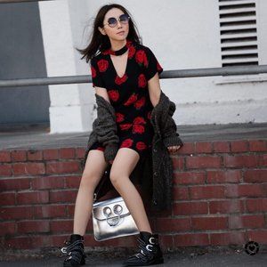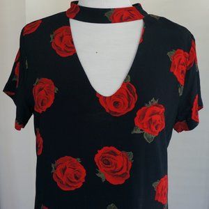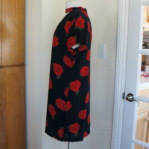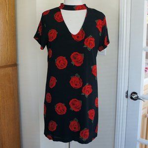 Chic black mini dress with vibrant red rose floral pattern. Short sleeves and a stylish cutout neckline. Perfect for any occasion.