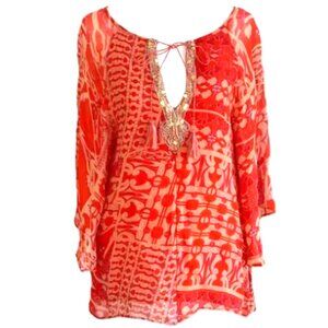 This vibrant Sanctuary top blends boho flair with statement details. Featuring a bold orange-coral-purple patchwork print, 3/4 kimono-style sleeves, and a flattering high-low hemline that’s shorter at the front center and drapes longer toward the sides and back. The front showcases a deep V-notch neckline with beaded applique embellishment, finished with a subtle tassel tie closure. Fully lined for comfort, this lightweight and flowy blouse is perfect for travel, resort wear, or pairing with denim for effortless chic.