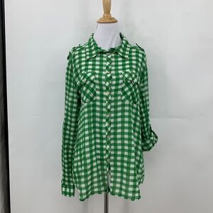SANCTUARY BUTTON UP SHIRT WOMENS L LARGE GRASS PLAID FLAP POCKETS TAB SLEEVE TOP