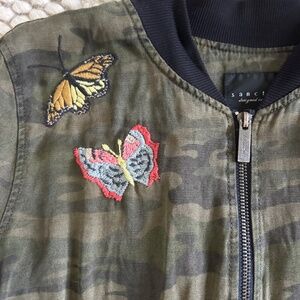 Sanctuary Camo bomber jacket with butterfly patches and zippers.