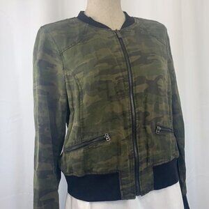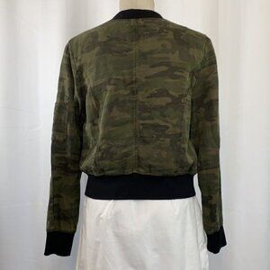 Green and brown lightweight denim jacket with camo print. Military bomber jacket styling with contrasting black details. Ribbed elastic hem and cuffs. Zip front. Zip front pockets and zip pockets on the arms. Nehru collar. Intentional distressing detail along the seams in back as pictured.