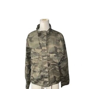Love this updated version of a classic camouflage jacket. Raw hem design gives it a chic look. Snap closure. Collar. Two front flap pockets and 2 front side pockets. Has a jean jacket look and style
