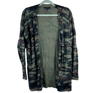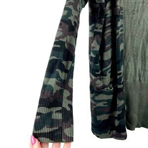 Pre-loved sanctuary camo open cardigan with 2 pockets. Long length covers your assets so you can wear leggings or shorts. Has ribbed trim. Super stretchy; marked as an XS but can fit u to a Small. Soft and cozy. As seen in photos, the right pocket has a string that has come undone; pocket is still functional.