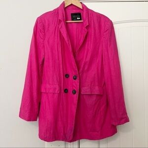 Pink linen (100% Linen). Blazer. Long sleeves. Exposed front button closure. Pockets. Fully lined.