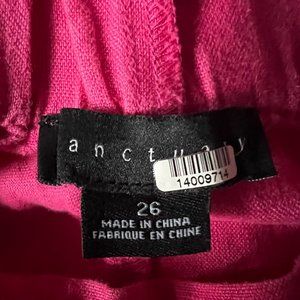- **Product Details:** Pink linen (100% Linen). Shorts. Hidden front zipper with bar-and-eye closure. Pockets. Rise: 12. Inseam: 3". 15" from shoulder to hemline. Imported.