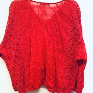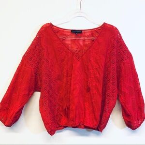 Geometric embroidered textures embrace this pretty boho top with tasseled cords lacing the V-neckline & airy lace insets at the sleeves. Elastic at the cuffs and hems creates a gently billowing silhouette