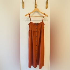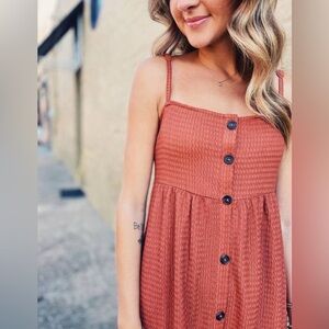 Description: This casual boho sundress features a lightweight textured knit in a warm earthy tone perfect for sunny days or early fall. The adjustable spaghetti straps and boxy, relaxed fit add comfort while the midi length and button front style add a playful touch.
