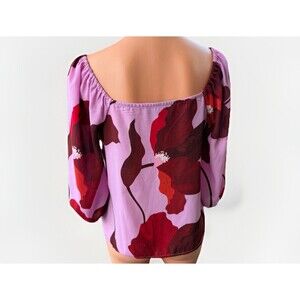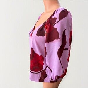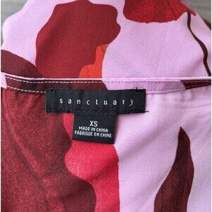 The Sanctuary Floral Blouse in size XS features a beautiful pink and maroon floral pattern, a V-neckline, and button front closure. Bust 18. With puff sleeves and a lightweight polyester material, this blouse offers a comfortable regular fit for women. It is a basic style top that is perfect for adding a pop of color to any outfit with its vibrant pink hue and feminine accents.