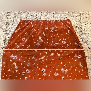Sanctuary Faux-wrap midi skirt, Rust Orange with Floral Print, Size L, NWT. Faux wrap with front twist detail at waist, in “Earth Bloom” colorway. Mid-calf length, A-line silhouette. Unlined. Split hem front slit. Hidden side zipper closure with hook and eye. Elastic back waistband. Floral print in cream, lavender, peach and black. Cute transition piece for autumn. Would look great with tights underneath as it gets cooler. New with tags attached, unworn. See photos as they form part of this description. Measurements taken laying flat: 15” waist, 22” hips at widest part, 29.5” from waist to hem. My measurements are approximate. See the online Sanctuary size chart for more size info. 100% recycled polyester. Machine wash cold, tumble dry low. Retail $89. Comes from a pet-friendly, smoke free home.