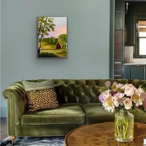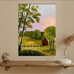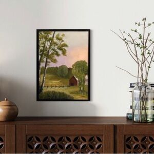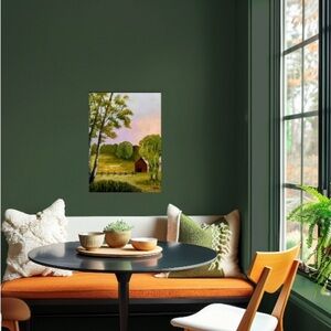 Transform your space with this tranquil countryside canvas art. Featuring a charming barn and lush green landscape, this piece brings nature indoors with its soothing green and brown hues.