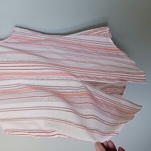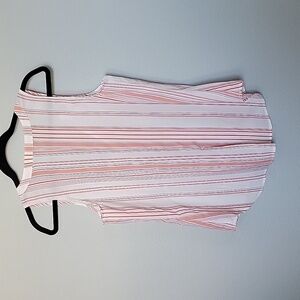 Salmon pink and black stripe with white background. Lightweight semi sheer fabric. Pockets at chest. Hidden button closure. There is a run in the fabric across 1 pocket see pic. There is also a little small dot of a mark on the back see pic its very faint and hardly noticeable. Split in the back. Summer, beach, light, airy, office, workplace, dinner, date night, brunch, pastel, soft girl. button front, button down, Sleeveless.